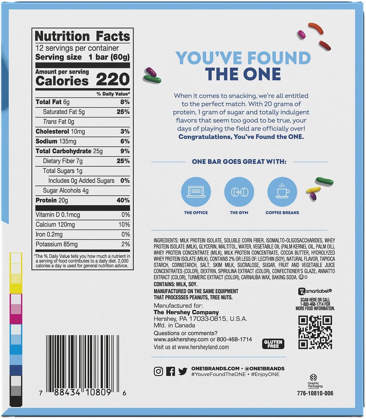 - THE ONE PROTEIN BAR: Congratulations, You’ve Found the ONE. Protein bar, that is. The decadent combination of salty, nutty peanut butter and the flavor of sweet, sweet chocolate just got a lot less guilty in the Gluten-Free Peanut Butter Cup Protein Bar.